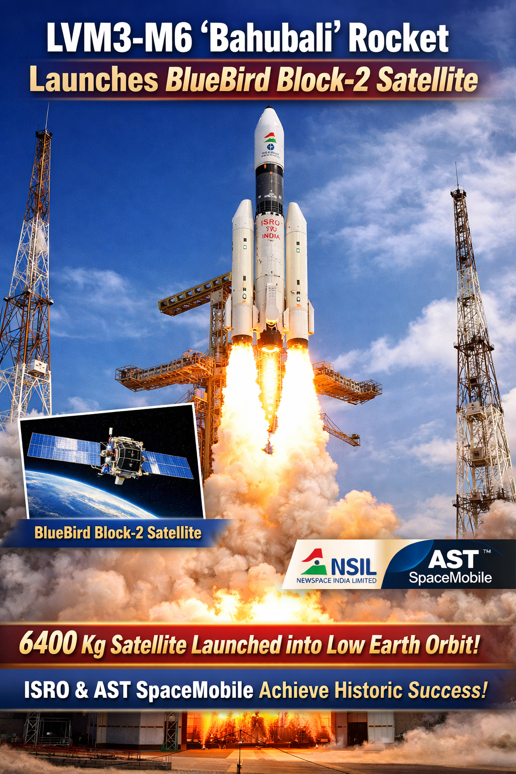 The LVM3-M6 mission carried the next-generation American communication satellite, BlueBird Block-2, into space. Weighing approximately 6,400 kilograms, BlueBird Block-2 is one of the heaviest commercial satellites ever launched by ISRO. The flawless liftoff highlighted the reliability and capability of India’s most powerful launch vehicle, widely known as the ‘Bahubali’ rocket.