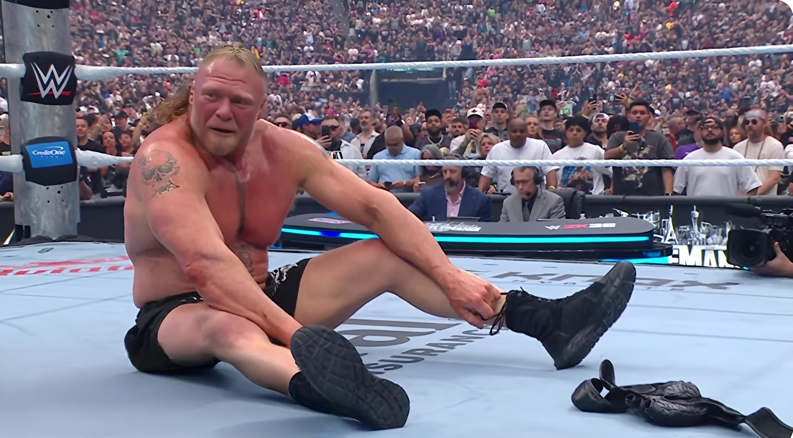 After the loss, Lesnar removed his wrestling gear and left it in the center of the ring. The crowd responded with chants of appreciation as he embraced his longtime manager Paul Heyman.
