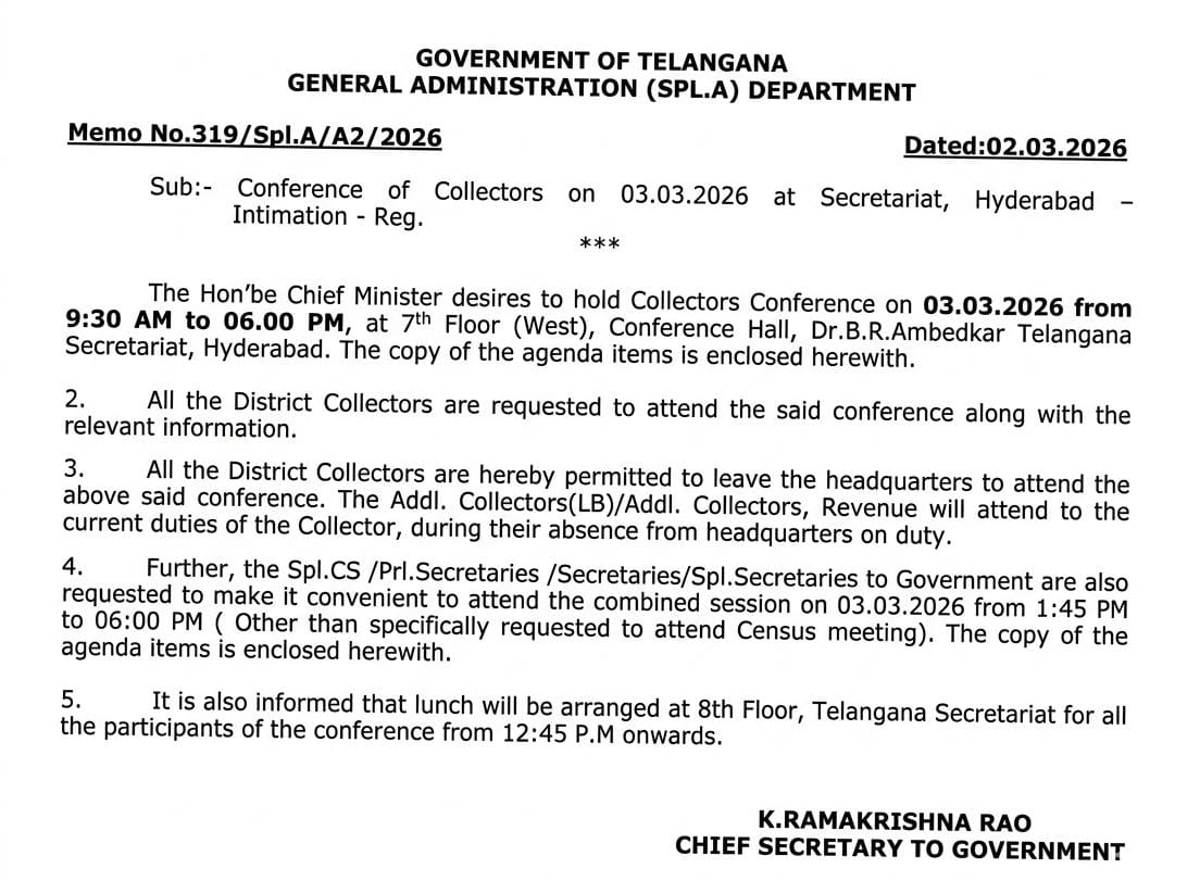 Hyderabad, March,02,2026: Telangana Chief Minister Revanth Reddy will hold a key meeting with collectors from all districts on Monday at the Secretariat.