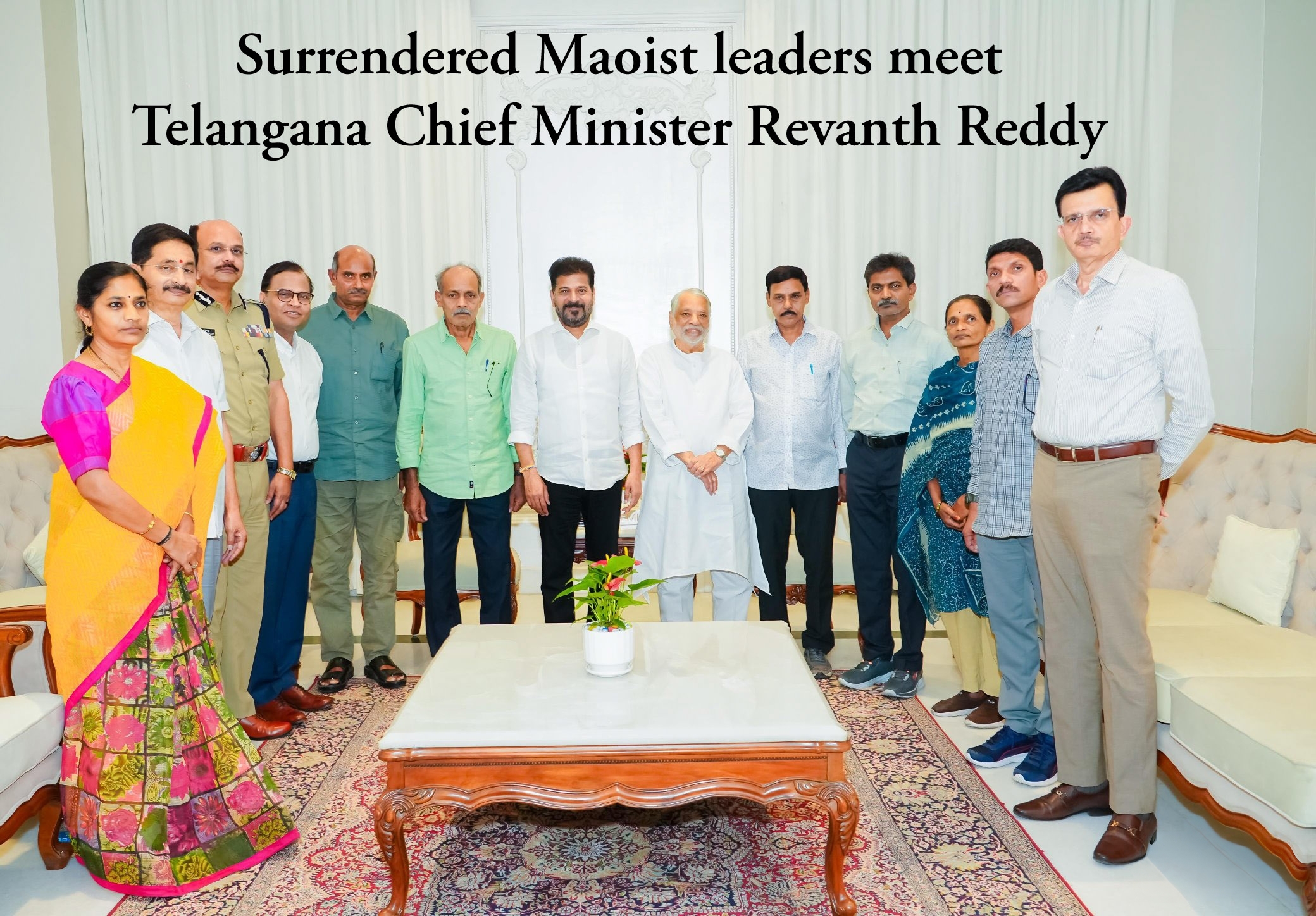The delegation included Thippiri Tirupati, also known as Devuji, Malla Raji Reddy, and four other former Maoist leaders. The meeting took place in Hyderabad on February 27, according to an official release.