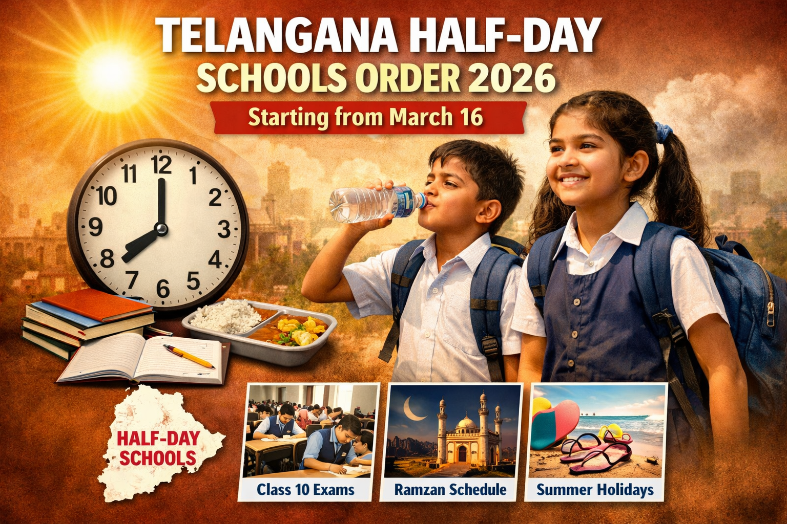 Hyderabad.18.02.2026:The Telangana government has issued a Telangana Half-Day Schools Order starting March 16, 2026, due to rising summer temperatures. New school timings, exam-related changes, Ramzan schedules, and summer vacation dates have been officially announced.
