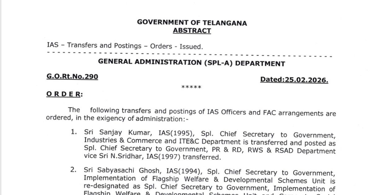 Hyderabad.26.02.2026: In a major administrative development, the Telangana government on Tuesday issued orders for large-scale Telangana IAS Transfers 2026, reshuffling 45 IAS officers across key departments and districts.