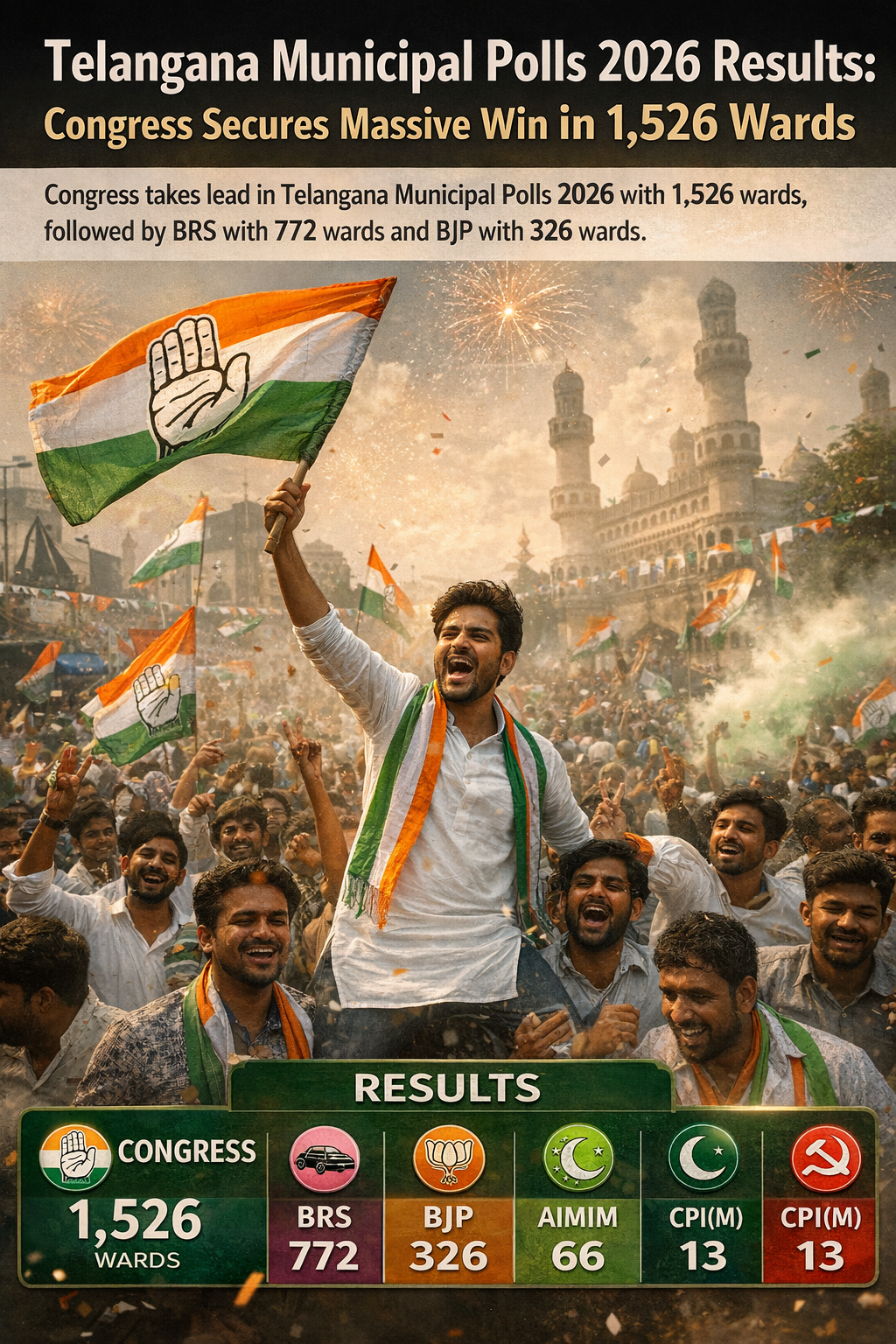 The Telangana Municipal Polls 2026 Results confirmed a strong performance by the Congress party in urban local bodies. Out of 2,958 wards declared, Congress crossed the halfway mark comfortably.