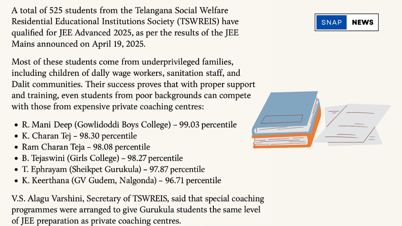 HYDERABAD | April 20, 2025: A total of 525 students from the Telangana Social Welfare Residential Educational Institutions Society (TSWREIS) have qualified for JEE Advanced 2025, as per the results of the JEE Mains announced on April 19, 2025.